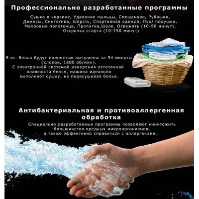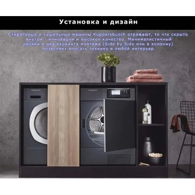 Dryer Kuppersbusch T 40.0 R Ever RosePrograms/additional programs: Automatic programs for cotton and wrinkle-resistant fabrics From iron dry to extra dry Special programs Basket dry, Pollen removal, Mixed, and other programs: Shirts, Jeans, Synthetics , Wool, Sportswear, Down/pillows, Terry towels, Impregnation, Silk, Refresh (10-90 minutes), Delay start (10-150 minutes) Favorites Stores up to 6 of your favorite programs Additional functions Antibacterial treatment, Gentle care +, Drying +, Delay start, Express 8 kg of laundry will be completely dried in 96 minutes (“in the closet”) Advantages: Large 4.3'' color display Basket for drying delicate fabrics and sports shoes Condensation dryer with Heat Pump technology and Autoclean self-cleaning system for efficient use of energy throughout the entire service life of the machine Highest level of condensation efficiency Antibacterial treatment program for hygienic drying of clothes Pollen removal program allows you to clean pollen from fabrics Excellent sound insulation, max. 61 dB(A)LED drum lightingAnti-crease protectionElectronic system for measuring the residual moisture of the laundry Indication of the program progress and time until the end of the program, delayed start - up to 7 daysIntensity-adjustable acoustic signal of the end of the programHatch opening angle - 180°, hatch diameter - 36/31 cm Possibility of reversing the hatch (right/left) Child lock Temperature control Special programs Basket drying It is advisable to expose wet wool items as little as possible, as they tend to wrinkle and shrink. Sports shoes can damage the drum due to their weight. Using the basket allows you to perform gentle drying without moving individual machine washable items: woolen items, sports shoes made of synthetic materials or artificial leather, hats, bicycle helmets, stuffed animals, toys, etc. Mixed This program is ideal for drying a mixed batch of cotton laundry. and synthetics Other programs Use these programs for optimal drying of various types of textiles, such as shirts, blouses, jeans, wool, etc. Additional programs Antibacterial treatment Selecting this program increases the additional drying time, which allows you to destroy most bacteria Gentle Care Plus For gentle drying of delicate items. Drying temperature reduced Delayed start Using this program, you can delay the start of the program to a later time in accordance with your usual lifestyle (for example, to take advantage of a preferential night electricity tariff) Drying + When you select this program, the drying degree is temporarily increased - for the duration of the selected program Time When opening time-controlled programs displays the minimum program execution time Express For quick drying of small batches or individual items made of cotton, synthetics or