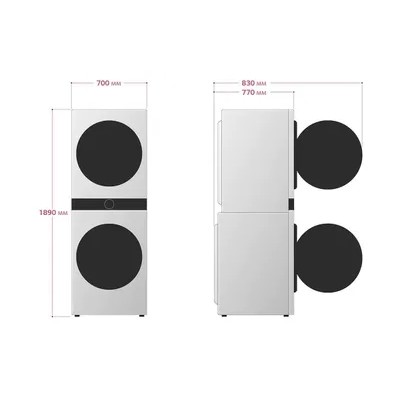 LG WashTower, 18kg Wash, 16kg Dry, Central Control, AI DD, ThinQLG WashTower is the first of its kind clothing care system that integrates a washer and dryer and combines everything you need: style, speed, ease and intelligence. Features: Convenient central control Multifunctional control panel based on the “everything at your fingertips” principle - so intuitive that you will wonder why it wasn’t there before. AI DD AI DD (Artificial Intelligence) technology selects the most optimal washing mode for your laundry, recognizing not only the weight, but also the type of fabric, determining up to 20,000 different characteristics. Smart Pairing The dryer receives wash cycle information from the washing machine (Wi-Fi) and automatically sets the required drying cycle to ensure that appearance and quality are maintained clothes. Just press Start. Complete washing and drying within an hour for small loadsLG's Quick Wash and Dry feature with Prepare to Dry feature completes a complete wash cycle in one hour for small loads, such as sportswear and pajamas.Easy cleaningThe condenser rinses automatically up to 3 times per cycle to eliminate lint and keep the dryer running.Connect and control remotelyThe LG ThinQ app makes it easy to connect and control your WashTower. Start washing and drying with the touch of a button. Highly reliable, vibration-free, low noise The WashTower uses a super reliable and very quiet direct drive inverter motor while ensuring long-lasting performance with a 10-year warranty on the washing machine motor. Featuring an energy-efficient DUAL heat pump Inverter Heat Pump with a 10-year warranty, you can rest assured about your dryer. General data: Dimensions: 189x70x77 cm Maximum washing load (kg): 17 Maximum drying load (kg): 16 Spin speed: 1100 rpm Spin class: Washing programs: CottonCotton+TurboWash30Everyday washDown itemsWoolRinse+SpinMy programDrying programs:DelicateStandardExtraIroningRefresh down jacketDrying by timeMy programAdditional functions:Variable spin speed (rpm): 1100/1000/800/600/400 Washing temperature range (° ): cold/20 /40/60/95° Steam function Add laundry Pre-wash Spin + Rinse Drum clean Intensive wash Delay timer: 3-19 hrs Control and indication: Auto restart Wi-Fi Remote start LED display Touch display Pattern indicator (dwelling time, temperature, rpm): 18:88 Sound signal On/Off Security systems: Foam sensor Mobile diagnostics Smart Diagnosis Door lock indicator Error indicator/Self-diagnosis Foam suppression system Additional information: Drum type: Bubble Door opening angle: 150 Loading hatch diameter (cm): 600 mm Ba volume