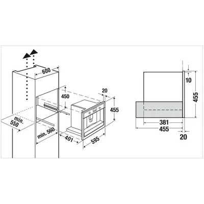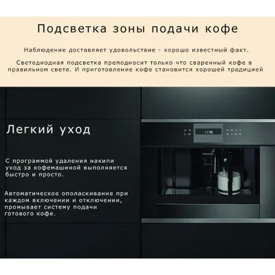 Built-in coffee machine Kuppersbusch CKV 6550.0 LCD display with text and graphic fields Electronic control system with touch buttons Programmable amount of coffee for 5 cup sizes (espresso, small, medium, large, high) Preparation of 1 or 2 cups Milk function for making cappuccino or latte Removable milk container with cleaning function Possibility of using coffee beans or ground coffee Height-adjustable coffee spout Brewing pressure 15 bar 3 coffee temperatures to choose from Selectable coffee strength (5 preset levels) Separate heaters for brewing coffee and preparing hot water Removal program limescale Automatic rinse when switched on and off Water tank fills from the front Electronic timer with white indicators Programmable start time Standby mode Telescopic guides for easy filling of the coffee machine Illuminated cups: Observation is a pleasure - a well-known fact. LED lighting presents the freshly brewed coffee in the right light. And making coffee becomes a good tradition. Tank for fresh water: Kuppersbusch ovens and coffee machines are easily built into any kitchen furniture, since thanks to the presence of a tank for fresh water, no connection to the water supply is required. Characteristics: Power consumption: 1.35 kW (Schuko plug) Dimensions of the device ( W x H x D): 595 x 455 x 475 mm (incl. 20 mm front and telescopic slides) Niche dimensions (W x H x D): 560 x 450 x 550 mm